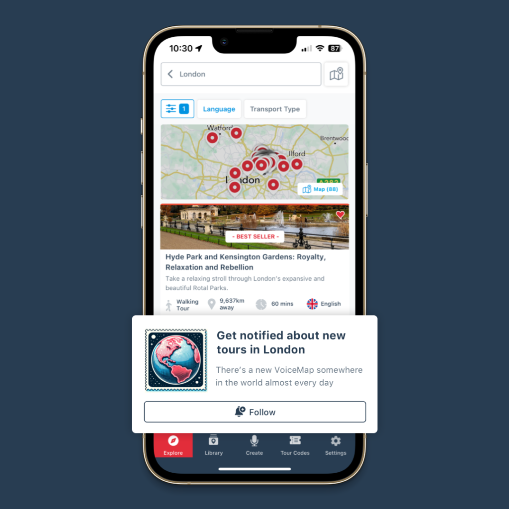 - Follow destinations and get a push notification or an email when there’s a new tour in London, Ljubljana, Los Angeles or the Liwa Oasis.